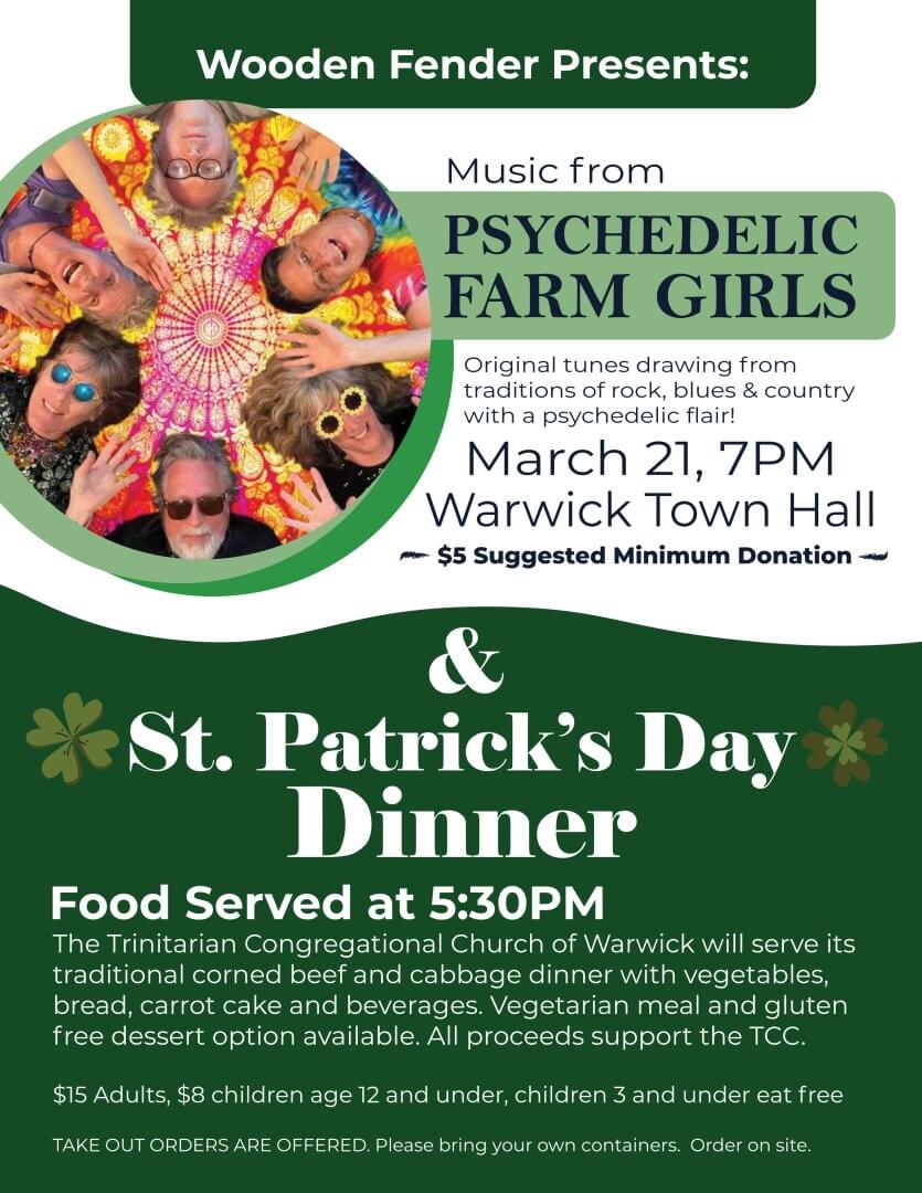 This Saturday, come out for the traditional corned beef and cabbage dinner with vegetables, bread, carrot cake and beverages from the Trinitarian Congregational Church of Warwick. Vegetarian meal and gluten free dessert option available. All proceeds support the TCC. Food is served at 5:30!